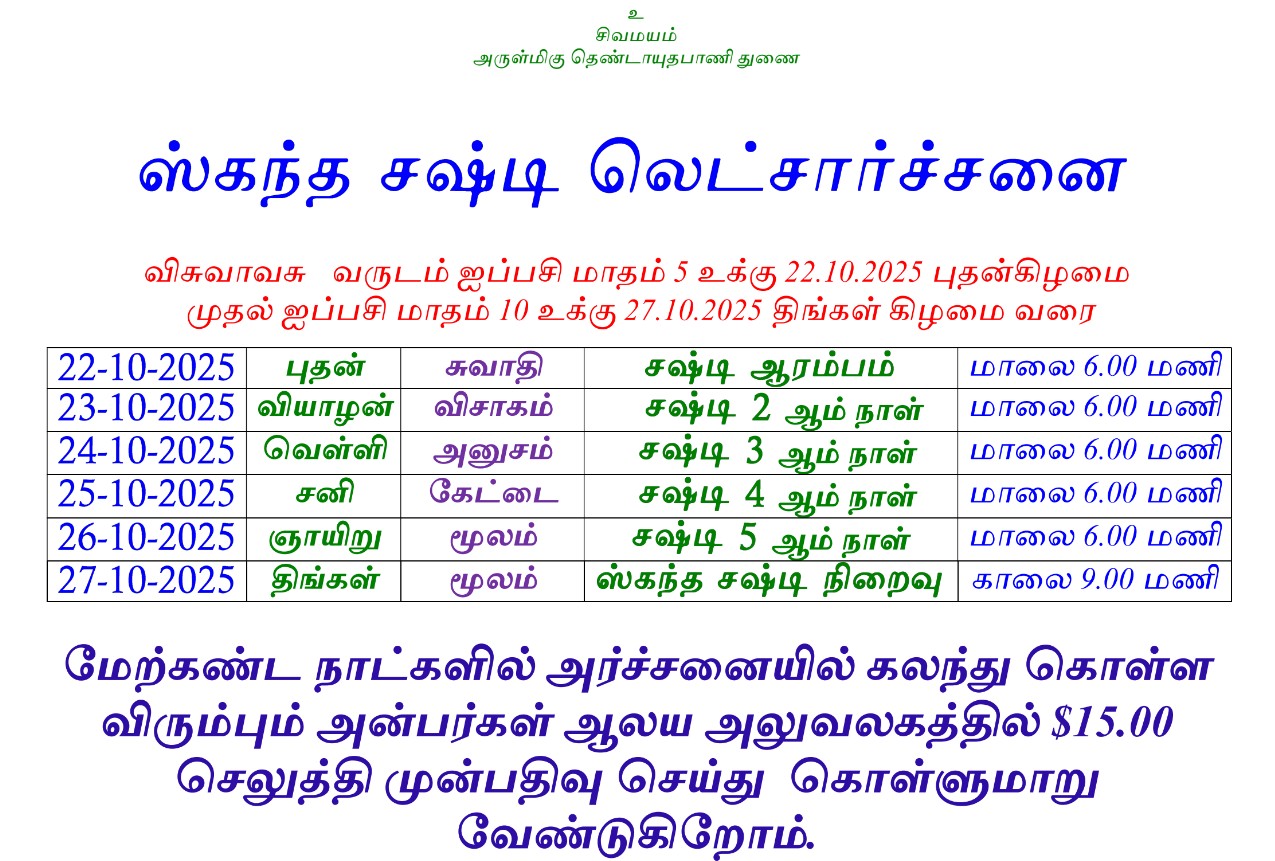 To participate in Skandha Sashti Letcharchanai, please contact Temple Office.